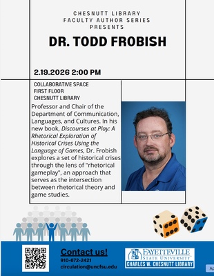 Dr. Todd Frobish speaks at the Chesnutt Library of Fayetteville State University about exploring a set of historical crises through the lens of "rhetorical gameplay", an approach that serves as the intersection between rhetorical theory and game studies.